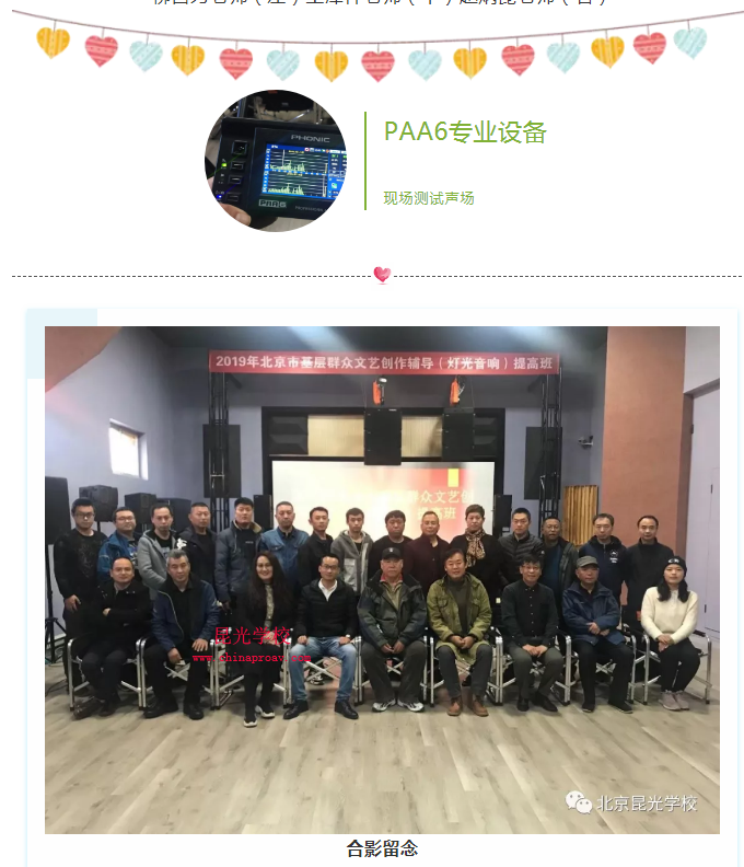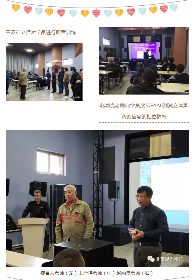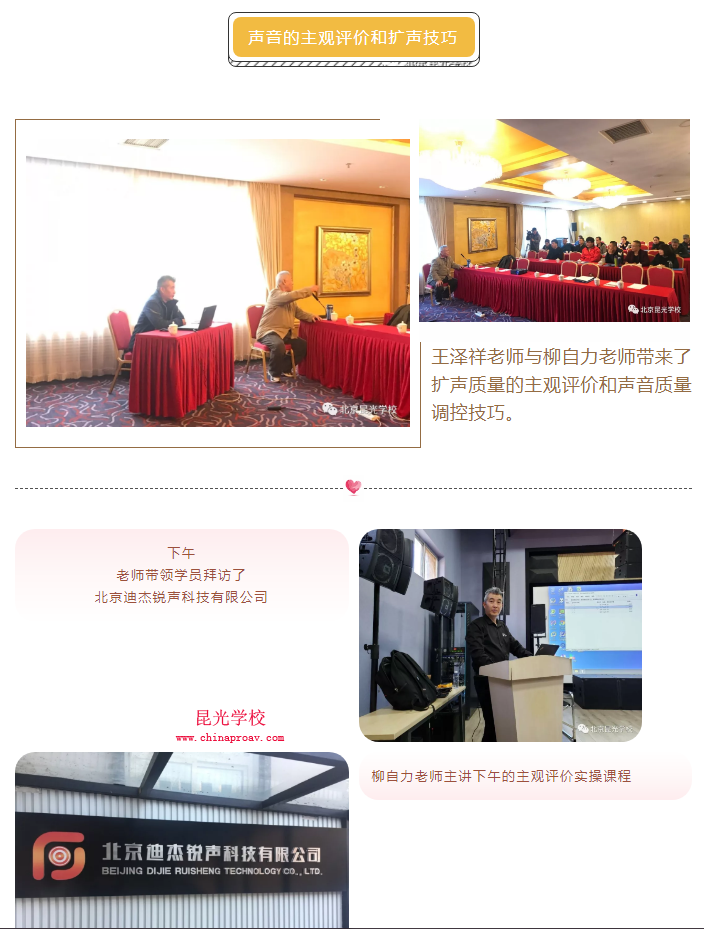 短暂的培训时光结束了,学员们感觉此次培训内容充实,针对性很强,并在标准上、实际测量上还有在数字化推广上及声音质量主观评价等方面受益匪浅。在此,昆光学校感谢百忙之中抽空为学员培训的各位老师,感谢老师们不辞劳苦的辛勤付出。感谢各支持此次培训活动的企业单位的大力支持。