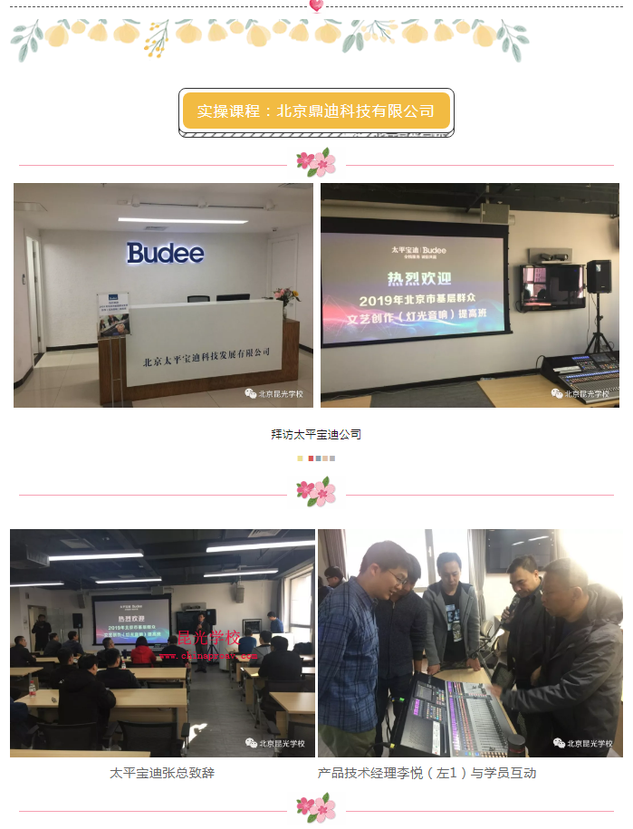 由北京市文化艺术活动中心主办,北京市西城区昆光职业技能培训学校(以下简称昆光学校)承办的2019年北京市基层群众文艺创作(灯光音响)提高班11月11日至15日,在北京东方酒店举办了开学典礼,北京市文化艺术活动中心相关负责人,昆光学校校长等出席。参加此次报名参加学员近40人,均来自北京市各个区县的文化馆、群艺馆等从事音响灯光管理操作人员。培训为期五天。