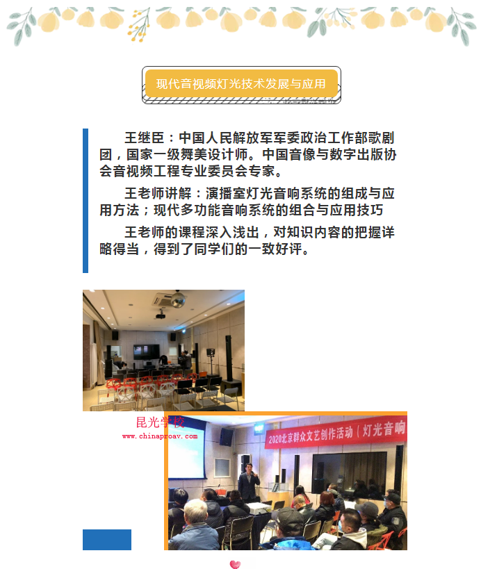 由北京市文化艺术活动中心主办,北京市西城区昆光职业技能培训学校(以下简称昆光学校)承办的2020年北京市群众文艺创作活动(灯光音响)创作辅导班11月9日至13日,在北京东方宾馆举办了开学典礼,北京市文化艺术活动中心相关负责人,昆光学校校长等出席。参加此次报名参加学员近40人,均来自北京市各个区县的文化馆、群艺馆等从事音响灯光管理操作人员。培训为期五天。