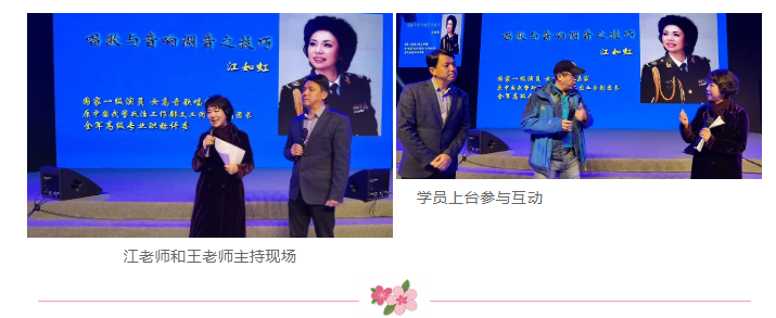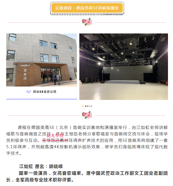 课程在德国美高SE(北京)音响实训基地和演播室举行,由江如虹老师讲解唱歌与音响调音之技巧,并与王继臣老师分享歌唱家与音响师交流与体会,现场学员积极参与互动。王继臣还真对环绕声扩声技术的应用,用SE音响系统组建了一套5.1环绕声,并用超高清4K投影机演示视听效果,使学员们身临其境体检了现代数字技术。