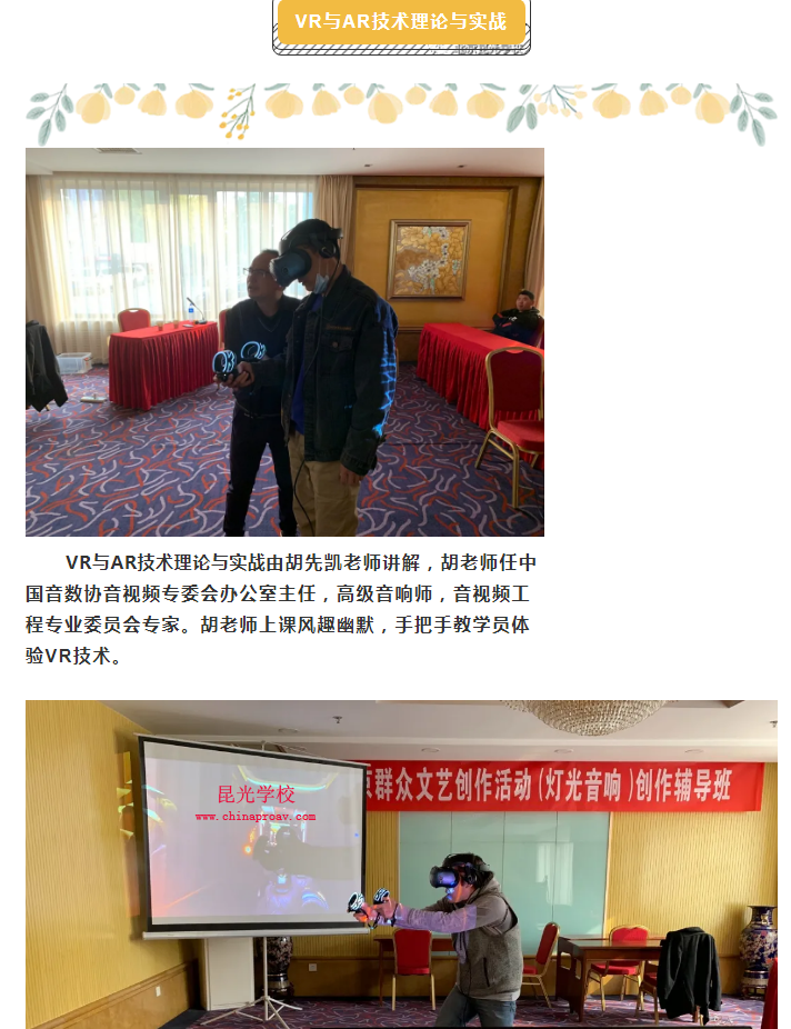 VR与AR技术理论与实战由胡先凯老师讲解,胡老师任中国音数协音视频专委会办公室主任,高级音响师,音视频工程专业委员会专家。胡老师上课风趣幽默,手把手教学员体验VR技术。