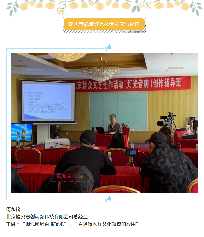 昆光学校常年致力于规范行业的发展,推进新技术、新工艺、新产品的普及,根据国际数字化、智能化、网络化发展,针对文化系统硬件设施的优化更新及应用质量,全面提高音视频从业人员专业技术水平,开展了此次有针对性的理论与实践培训。